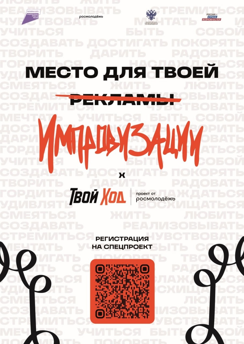 Спецпроект «Твой Ход х Импровизация» направлен на развитие творческих компетенций студенческой молодежи, формирование молодежного юмористического движения и кадрового резерва для российских креативных индустрий, вдохновляет студентов быть активными гражданами и привносит позитивные изменения в обществе путем участия в творческих проектах и создания собственных. К участию приглашаются обучающиеся образовательных организаций высшего образования и среднего профессионального образования, которые хотят развиваться в направлении игр в составе дуэтов (выступление на сцене в паре с другим участником). Осенью пройдут региональные отборочные этапы, а в декабре участники встретятся на финале в рамках итогового мероприятия Проекта. ➡️Регистрация на вторую волну участия продолжается по 20 сентября. На базе образовательных организаций высшего образования, организаций среднего профессионального образования и региональных команд создаются клубы по Импровизации, где студенты развивают ораторские и ком
