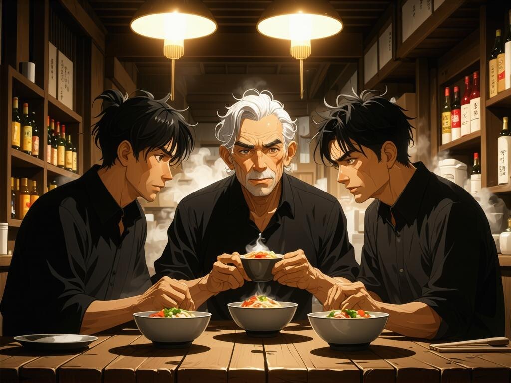 За соседним столом, окруженный ореолом всеобщего уважения, сидел их старший коллега, старый мастер Танака-сан. Ему было под семьдесят, он застал еще послевоенное возрождение Японии и был живой легендой в компании. Уловив обрывки их разговора о «векторах» и удаче, он хитро прищурился и подозвал их к своему столу, густо наливая им саке.