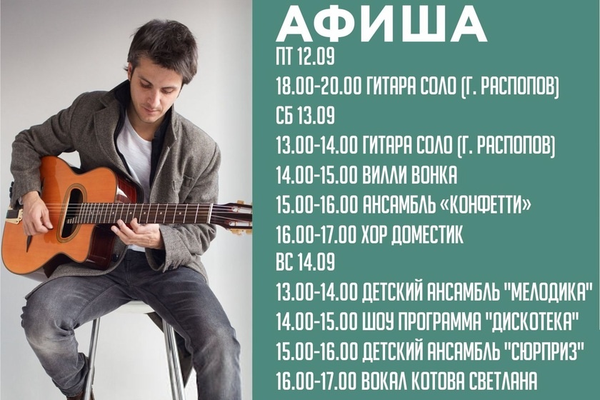 Как прекрасно в выходной день проснуться не по будильнику, не торопясь позавтракать и отправиться на прогулку. Обязательно загляните в ТРЦ «Карнавал». Здесь вы сможете совершить необходимые покупки, вкусно пообедать, сходить в кинотеатр, а детей отправить в игровой центр. 19 сентября (пт) 18:00 - 20:00 Медведев Андрей (саксофон) 20 сентября (сб) 13:00 - 14:00 Ансамбль «Конфети» 14:00 - 15:00 Шоу мыльных пузырей 15:00 - 16:00 Дуэт «Братья Шаравьевы» 16:00 - 17:00 «Невелик дуэт» Тапиша и А.Захаров(вокал и саксофон) 21 сентября (вс) 13:00 - 14:00 Дуэт «Прованс» 14:00 - 15:00 «Игра в Кальмара» 15:00 - 16:00 Дуэт две скрипки 16:00 - 17:00 Ансамбль «Сюрприз» Вход свободный! 3 этаж ТРЦ «Карнавал» (сцена в зоне фудкорта)