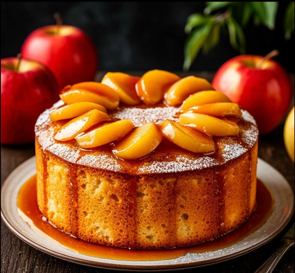 Аккуратно вылейте готовое тесто поверх яблок в форме.