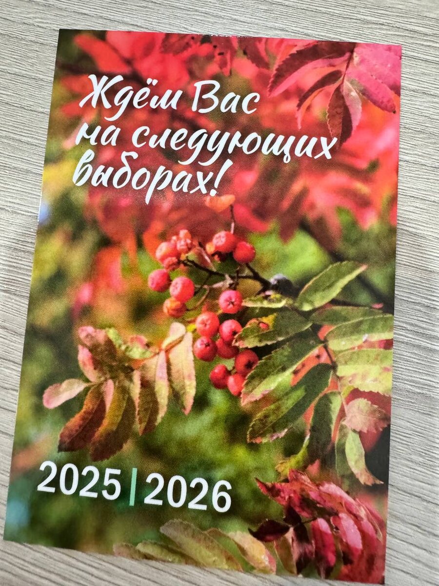 На избирательном участке вам подарят календарик с напоминанием: следующие выборы в 2026 году. И даже даты отмечены: 18, 19 и 20 сентября. В 2026 году нас ждут выборы депутатов Государственной Думы, Законодательного собрания и Депутатов Думы Березовского муниципального округа. Календарик, кстати, для очень зрячих. Шрифт настолько мелкий, что глаза слезятся. @zg66