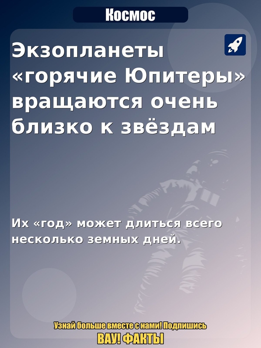 Экзопланеты «горячие Юпитеры» вращаются очень близко к звёздам. Их «год» может длиться всего несколько земных дней. Интересный факт по теме «Космос»: Экзопланеты «горячие Юпитеры» вращаются очень близко к звёздам. Почему так: Их «год» может длиться всего несколько земных дней.. Поделитесь в комментариях, знали ли вы об этом и стоит ли делать продолжение по теме. #космос #факты #астрономия
