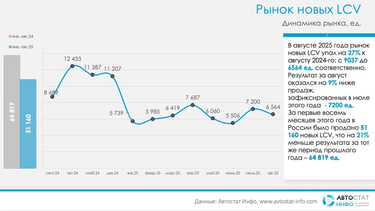 LCV в августе: минус 27% к 2024 году, но Largus становится главным драйвером По данным «Автостат Инфо», рынок новых LCV в августе 2025 года зафиксировал 6 564 регистрации, что на 27% ниже уровня августа 2024-го (9 037 ед.) и на 9% меньше июля 2025-го (7 200 ед.). За январь–август продано 51 160 машин — на 21% меньше, чем за тот же период прошлого года (64 819 ед.). При этом текущий результат остается выше январского «дна» 2025-го (5 739–5 985 ед. в январе–феврале), но заметно слабее осенних пиков 2024 года. В брендовом раскладе август сохранил доминирование ГАЗа при стремительном усилении Lada. ГАЗ реализовал 3 194 автомобиля и занял около 48,7% рынка августа (год назад 4 700 ед.; −32% год к году). Lada продала 1 302 ед. и довела долю до 19,8% (в августе 2024-го было 884 машин; +47%), став главным противовесом падению. Далее следуют УАЗ — 729 ед. и 11,1% доли (−48% год к году) и Sollers — 628 ед. и 9,6% (−47%). Из нишевых игроков в плюсе Foton — 176 ед. и 2,7% (+151% год к году) и Me