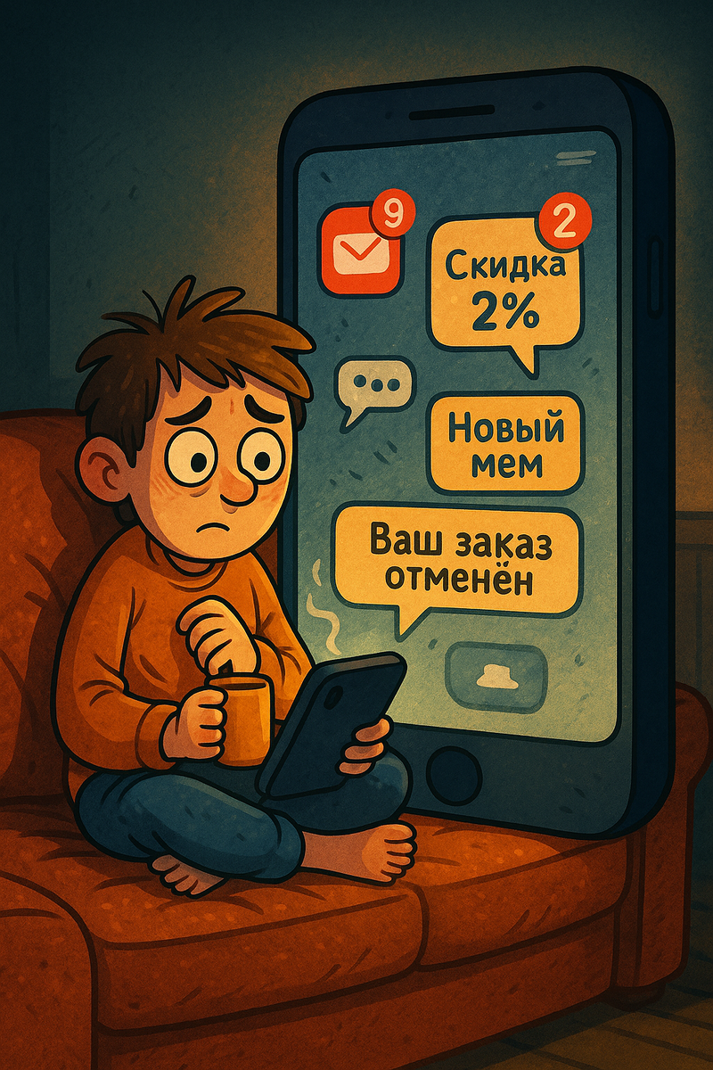 Телефон — это твой самый преданный друг и главный враг одновременно. Он всегда рядом: утром первым будит тебя, вечером усыпляет под ленту мемов. Кажется, ты держишь телефон, но на самом деле он держит тебя. Уведомления сыпятся без конца. Почта, мессенджеры, соцсети, «ваш заказ оформлен», «ваш заказ отменён», «вы выиграли скидку в 2%». И ты кликаешь всё подряд, словно жизнь зависит от красных кружков на экране. Телефон — мастер красть время. «Посмотрю видео на минутку» превращается в три часа. «Зайду в ленту на пять минут» — и уже полночь, а ты знаешь всё про котов, ремонт и почему нельзя мыть голову в полнолуние. И всё же без телефона жить невозможно. Он стал частью тебя. Ты ругаешь его, но боишься забыть дома больше, чем паспорт. Телефон — это не гаджет. Это современный хозяин, которому мы добровольно сдаём свою жизнь в аренду.