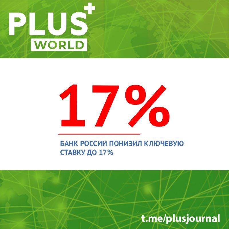 Банк России снизил ключевую ставку до 17% Об этом сообщается на сайте регулятора. Решение совпало с ожиданиями экономистов и аналитиков. https://plusworld.ru/articles/67341/