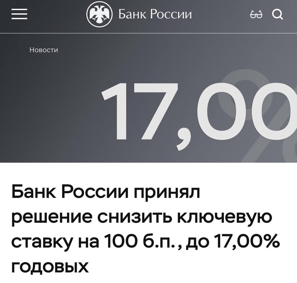Хорошая новость! Сегодня ЦБ снизил ставку до 17% 🤝