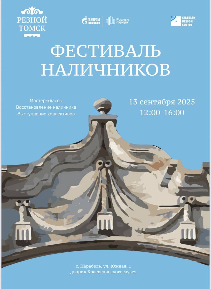 🔆 Дорогие жители Парабельского района! Завтра, 13 сентября с 12:00 до 16:00 в Парабели на территории краеведческого музея пройдет «Фестиваль наличников». В программе: 🌿Мастер‑классы по восстановлению резных наличников 🌿Гончарное дело 🌿Лекции о культурном наследии Сибири и путешествиях 🌿Медиа‑школа для всех желающих 🌿Концерт танцевального коллектива ветеранов и многое другое Приходите всей семьёй, чтобы прикоснуться к традициям Томской области.