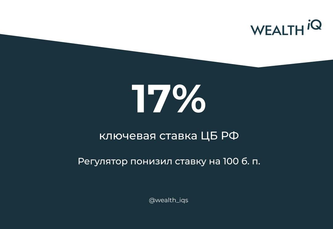 ❗️ Ключевая ставка ЦБ — 17%. Регулятор понизил ставку на 100 б. п. В пресс-релизе по ключевой ставке Банк России отметил, что проинфляционные риски по-прежнему преобладают над дезинфляционными на среднесрочном горизонте. В последние месяцы активизировался рост кредитования. Высокими остаются и инфляционные ожидания. Регулятор снова подал нейтральный сигнал: дальнейшие решения по ключевой ставке будут приниматься в зависимости от устойчивости замедления инфляции и динамики инфляционных ожиданий. #макроэкономика 🏦 @wealth_iqs