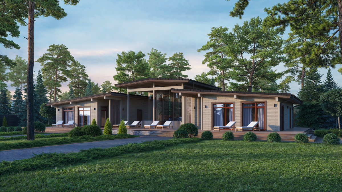 Проект возможно адаптировать под потребности конкретного бизнеса — как по внутренним площадям помещений, так и с учетом особенностей участка застройки, что делает его универсальным решением для различных форматов коммерческой недвижимости на загородных курортах и рекреационных объектах. Проект сочетает современную архитектуру, продуманные инженерные решения и функциональную планировку, что позволяет сократить сроки строительства