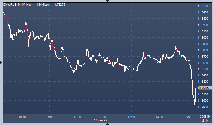 Рубль немного вырос, акции упали Курс доллара к рублю расчётный, фьючерс, вечный фьючерс и межбанк. Курс евро к рублю расчётный, фьючерс, вечный фьючерс и межбанк. Курс юаня к рублю биржевой, фьючерс, вечный фьючерс и межбанк. Курс рубля отреагировал незначительным ростом с уровня 11,88 за китайский юань до уровня 11,80 на решение Банка России снизить ставку всего на 1%. Акции России отреагировали более выражено, снизившись по фьючерсу на индекс Мосбиржи с отметки 290675 до 287 325. Совет директоров Банка России 12 сентября 2025 года принял решение снизить ключевую ставку на 100 б.п., до 17% годовых. Устойчивые показатели текущего роста цен значимо не изменились и в основном остаются выше 4% в пересчете на год. Экономика продолжает возвращаться к траектории сбалансированного роста. В последние месяцы активизировался рост кредитования. Высокими остаются инфляционные ожидания. Банк России будет поддерживать такую жесткость денежно-кредитных условий, которая необходима для возвращения инф