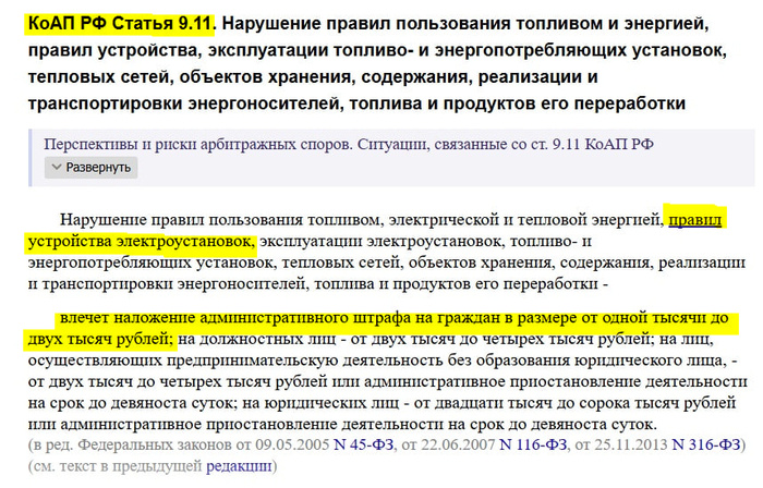 Кто рассказывал, что ПУЭ не обязательны? Может, и необязательны, но у технадзора и прокурора мнение иное, и ответственность за нарушение ПУЭ - вполне реальная. 9.11 КоАП предусматривает административную ответственность за нарушение ПУЭ. На Консультанте даже прямой линк есть, именно на ПУЭ, в тексте. Что бы исключить кривотолки вовсе. Открываем судебную практику, видим, что суды, внезапно, считают нарушение ПУЭ недопустимым. Но рукожопам авторитетнее ответ Минэнерго, в котором говорится, что ПУЭ носит рекомендательный характер. Поэтому про регистрацию в Минюсте и про то, что ПУЭ не подлежат обязательному применению будете рассказывать на допросе у следователя, или при обжаловании судебного решения. Но будет поздно. В настоящее всем, не смотря ни на что, ПУЭ является самым полным и доступным документом по данной теме. За более актуальными знаниями рекомендую обращаться к СП 256.1325800.2016 (Изм.1-6), который во многом заменил ПУЭ. Подписаться на Пикабу Познавательный. и Пикабу: Истории