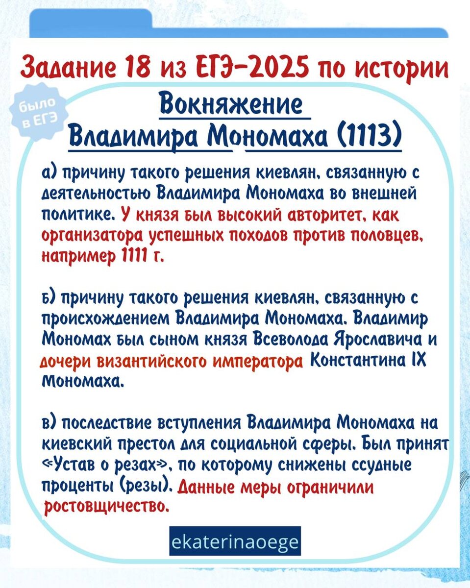 Разбор задания 18 по истории с реального 🔤🔤🔤🔤2️⃣0️⃣2️⃣5️⃣ 🤝🤝🤝🤝🤝🤝🤝📲 Вокняжение Владимира Мономаха (1113) а) причину такого решения киевлян, связанную с деятельностью Владимира Мономаха во внешней политике б) причину такого решения киевлян, связанную с происхождением Владимира Мономаха в) последствие вступления Владимира Мономаха на киевский престол для социальной сферы Ловите карточку с ПСС на максимальные 🤝 первичных балла. Не жалейте 🔥 и запоминайте! ❓Нужны ли разборы других заданий с реального ЕГЭ по истории? 👍🏻-да 🤯-нет P.S. Хотите научиться попадать в ключи экспертов и получать максимальный балл за задание? Жду вас на годовом курсе!