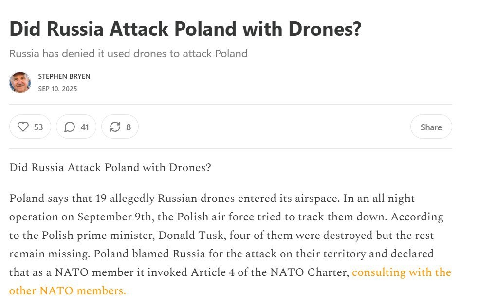 Украинцы могли взять российские дроны под контроль и направить их в Польшу — экс-помощник главы Пентагона Стивен Брайен «Я вижу в этом инциденте провокацию с целью добиться большего количества оружия от стран НАТО», — заявил экс-помощник. По его словам, он склонен поверить в эту версию, поскольку ни один из районов, где дроны были перехвачены, не был «ни в малейшей степени важным», а контроль над этими дронами был бы отличным способом организовать провокацию. Хоть кто-то задумался... 👍 БайБайден. Подписаться