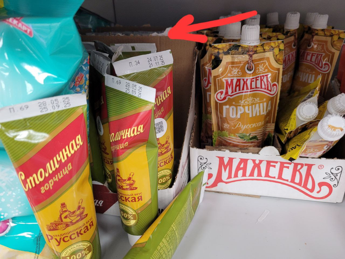 На виду лежал вчерашний хлеб, но я смогла найти сегодняшний. Обычно в таких случаях ищу самый нижний ряд лежащих насыпом упаковок. Но в этот раз проверенный способ не помог. Оглянувшись, я решила проверить ещё одну гипотезу. И вот она сработала безотказно! Не буду интриговать, расскажу о тех способах, которые обнаружила опытным путём. У меня нет знакомых продавцов, но есть любопытство и желание положить в продуктовую корзину самый свежий товар из возможных. Думаю, вы эту цель разделяете. Будет интересно обменяться опытом! Не буду ходить вокруг да около, думаю, об этом способе знает каждый. Чтобы в продажах работал принцип бережливого производства «Первым пришел — первым ушёл», товары на полках располагают по сроку годности. Самые свежие ставят как можно дальше, а в быстром доступе оставляют то, что надо скорее продать. На фото пример с горчицей: у ближайших ко мне тюбиков срок годности кончится через две недели. Но я нащупала за батареей тюбиков ещё один ящик и достала оттуда горчицу,