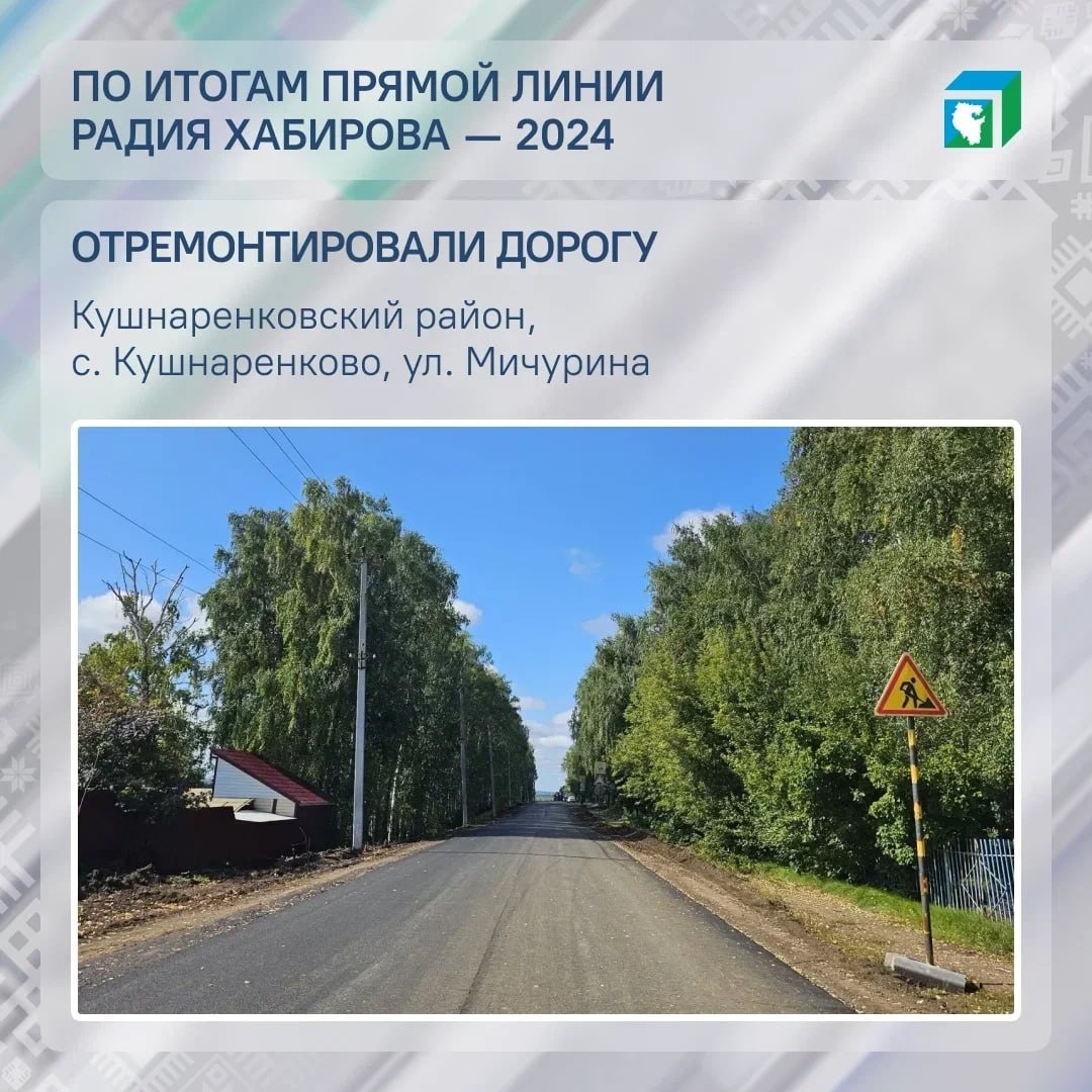 😀😃😄😁 В селе Кушнаренково по улице Мичурина отремонтировали дорогу. Об этом попросили жители Кушнаренковского района. Со своей просьбой они обратились на Прямую линию Главы Башкортостана Радия Хабирова в декабре 2024 года. Видеообращение они отправили на Платформу обратной связи. Коллеги из администрации Кушнаренковского района взяли обращение на контроль. Дорожники сначала полностью сняли старый асфальт, разровняли грунт, далее завезли материалы и начали асфальтировать участок. К началу сентября 2025 года все работы завершили. 💚 ЦУР Башкортостана