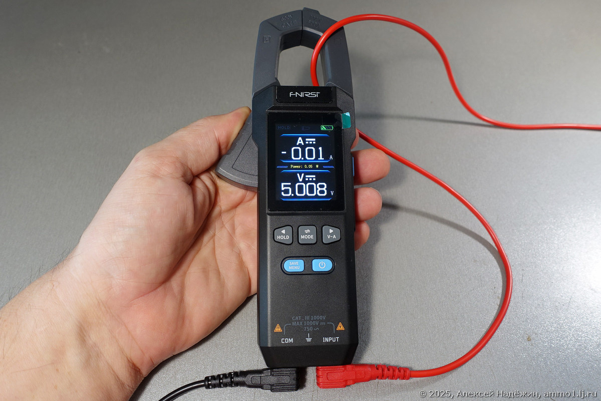 Длительное нажатие кнопки "V-A" запускает режим одновременного измерения напряжения и тока с подсчётом мощности. Тип напряжения или тока (постоянный или переменный) определяются только автоматически, сохранение данных в этом режиме не работает, мощность отображается очень мелко. Единственный способ запомнить текущие значения трёх параметров - "заморозить" экран длительным нажатием кнопки "HOLD".