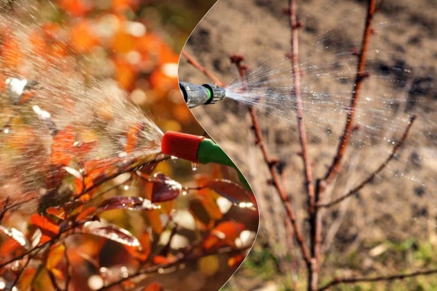 - Порядок обработки: Сначала необходимо убрать и сжечь все опавшие листья, ветки и мумифицированные плоды. После этого проводится опрыскивание почвы, а затем — деревьев и кустарников.