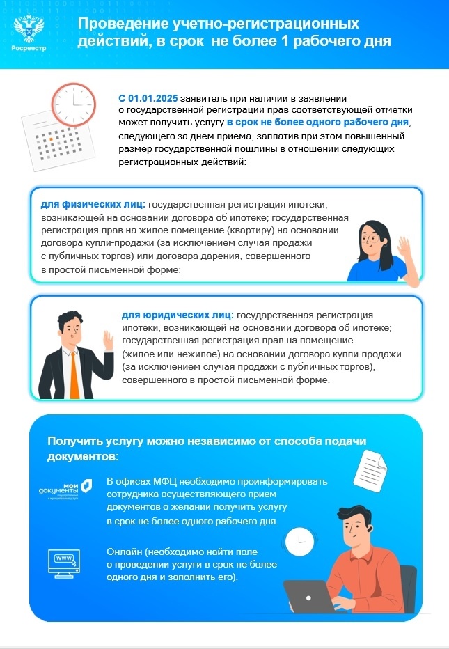 Управление Росреестра по Челябинской области напоминает о возможности сокращения срока государственной регистрации прав на недвижимость. При обращении в ведомство заявители часто интересуются, возможно ли ускорить сделку. Да, с начала 2025 года гражданам и юридическим лицам доступно оформление недвижимости в ускоренном порядке. Такая услуга востребована теми, кто торопится стать собственником недвижимости или заинтересован в скорейшем завершении всех юридических действий по продаже объекта недвижимого имущества. Например, вторая сторона сделки проживает за границей и прилетала на короткое время, продавец имеет проблемы со здоровьем и ложится в больницу или молодой человек спешит оформить недвижимость перед вступлением в брак и т.п. При наличии в заявлении о государственной регистрации прав соответствующей отметки заявитель может получить услугу в срок не более одного рабочего дня, следующего за днем приема, заплатив повышенный размер госпошлины, в отношении следующих регистрационных
