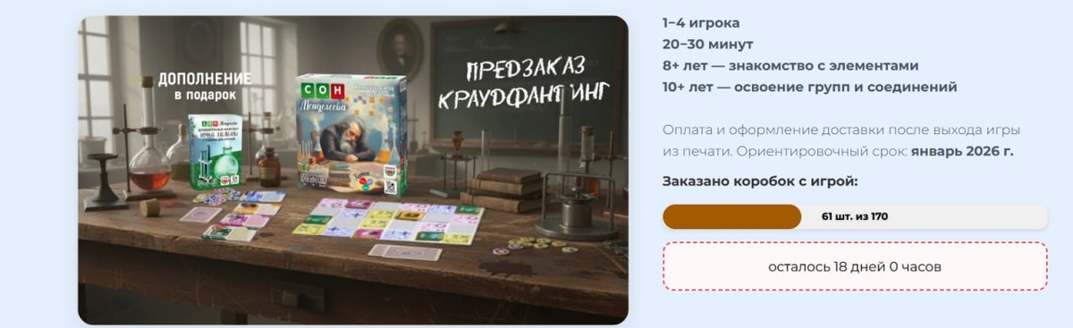 Уже 61 коробка! И целых 18 дней. Не упустите свой шанс получить отличную и полезную семейную игру по Химии и дополнение ценой с РРЦ в 1125 рублей в подарок! https://simplrobot.ru/sonmendeleeva2 P.S. По безналичному расчету по этой же цене также можно приобрести от 20 коробок.