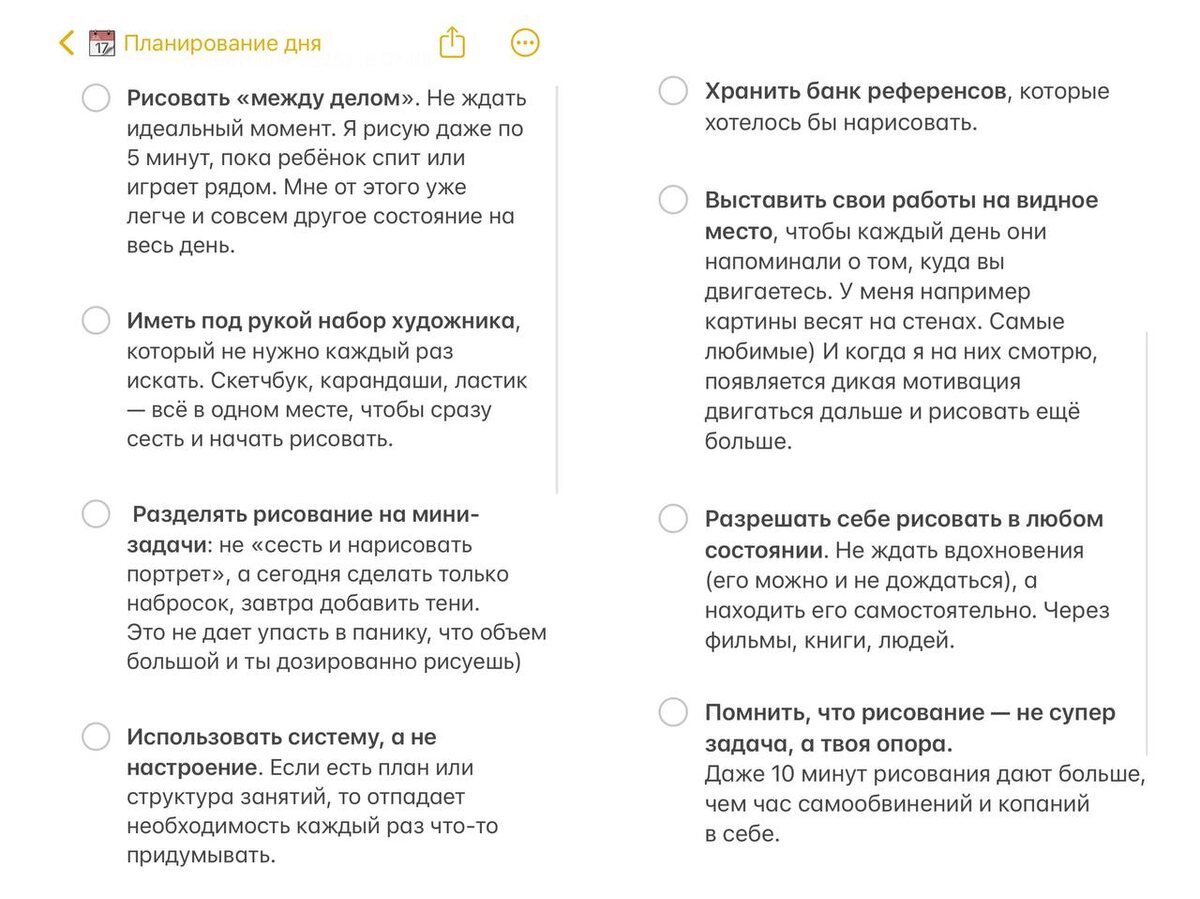 Вот ещё 8 неочевидных лайфхаков, как я успеваю рисовать даже в насыщенные дни Это то, что обычно остаётся за кадром, но очень помогает держать фокус и не выпадать из творчества Особенно про набор художника, мини-задачи и работу с внутренним состоянием В подкасте (клик) —фундамент, основа А здесь — фишки, которые усиливают и поддерживают