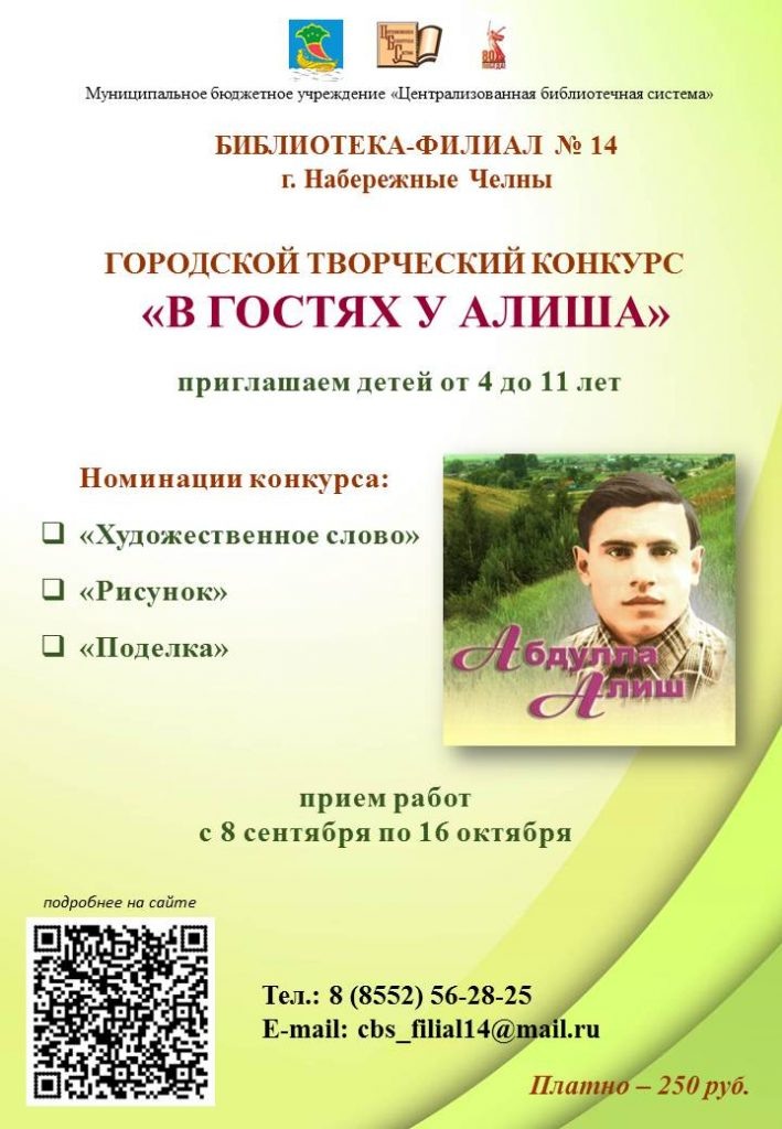 С 8 сентября по 16 октября 2025 года МБУ «Централизованная библиотечная система» приглашает детей от 4 до 11 лет принять участие в городском творческом конкурсе «В гостях у Алиша». На Конкурс принимаются рисунки и поделки, созданные по произведениям Абдуллы Алиша, выполненные в любом формате и любой изобразительной технике. Выразительное чтение наизусть стихотворения или прозы наизусть или инсценировка отрывка произведения Абдуллы Алиша. Выступление участников очное, по предварительной заявке и договоренности.