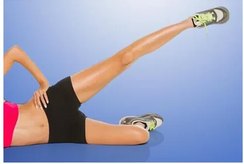 - На выдохе поднимаем бедро так, чтобы оно было параллельно полу.
