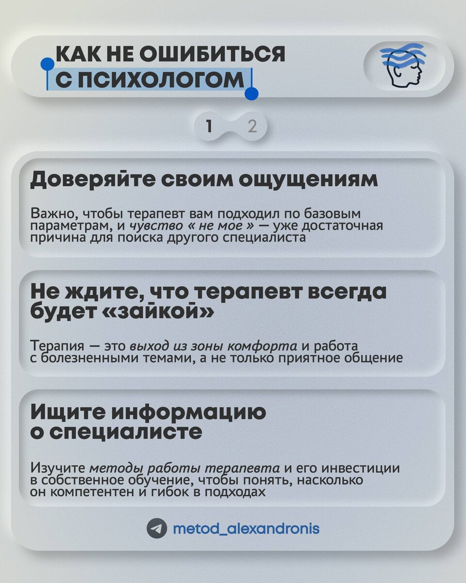 «Я там был, и мне там не понравилось» Каждая вторая встреча с новым клиентом начинается с этой фразы. «Там» - это, как ни странно, психотерапия. Спрашиваю: что не так? Ответы могут быть самые неожиданные: от «мне обязательно, чтобы психотерапевт была женщина» до «мне его голос не нравился». Но в 40 % случаях это «нет результата». Статистика тревожная, и вот что, по моему разумению, можно сделать, чтобы в нее не попасть. 1. Доверяйте своим ощущениям. Если вам важны пол, возраст, манера общения или внешность терапевта, не пытайтесь себя убедить, что «стерпится - слюбится». Не слюбится. Даже если у специалиста высокая квалификация и отличные отзывы. «Не мое» - это вполне нормальная причина искать другого специалиста. 2. Не ждите, что терапевт всегда будет с вами «зайкой». Вы пришли развиваться, а это всегда выход из зоны комфорта. Кроме того, в терапии могут быть затронуты болевые точки, ведь почти у каждого из нас есть психологические травмы. Хороший специалист не будет их обходить, о