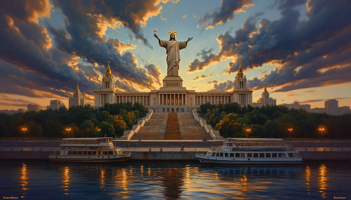 В 1930-е монархия удержала альтернативную Российскую империю — и она выбрала стоять над схваткой. Идея власти как арбитра воплотилась не в манифесте, а в камне и свете. На Воробьёвых горах вырос «Вознесенский кафедральный собор»-небоскрёб с гигантской статуей Спасителя, возвышающейся над Москвой. Сегодня будет обзор этого величественного здания и скульптуры в стиле ар-деко. Я вижу Романовых, которые лавируют между правыми, левыми и центром. Они возвращают патриарха в 1918 г. и поддерживают Церковь делом, а не словами. Сначала — кафедра в Храме Христа Спасителя в Москве, затем — новая доминанта. Место силы и символ арбитража в бурном веке модерна и разломов. Решение простое: вынести кафедру на высоту — к свету и ветрам Москвы. Проложить Воскресенский проспект от Кремля через Хамовники — на юго-запад. Создать прямую визуальную ось: трон, алтарь и горизонт первостольной. Городская ткань получает нерв, а смысл — ясную перспективу. Ступенчатый силуэт, классический ритм, чистые вертикали. Д