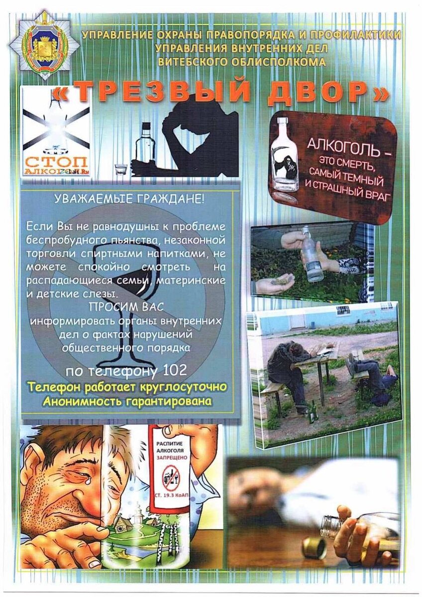 ❗️❗️❗️❗️Бешенковичские милиционеры усиливают контроль в общественных местах 👮♂️С 12 по 14 сентября на территории района в целях профилактики преступлений и правонарушений, совершаемых в общественных местах, в том числе в состоянии алкогольного опьянения, проходит профилактическая акция «Трезвый двор». ❗️Правоохранители просят информировать органы внутренних дел о фактах нарушения общественного порядка по телефону 102.