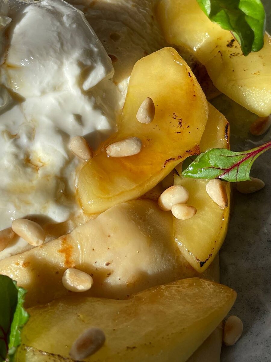 Блинчики с бураттой, карамелизированными яблочками, кленовым сиропом и кедровым орехом. Буратту можно заменить на страчателлу, творожный сыр, мороженое. Кленовый сироп на сироп топинамбура, кленовый или жидкий мед. Делаю блины. Беру каждый блин за центр круга и хаотично выкладываю на тарелку по 2 шт на порцию. Жарю яблоки: нужен твердый сорт, у меня по яблоку на порцию. Разогреваю сковороду, огонь 5 из 9. На сковороду кладу 1 ч л топленого масла или 2 ст лмасла для жарки. Жду полного разогрева 5 мин, на холодную ничего не кладу. Яблоки очищаю от кожуры, режу на четвертинки, удаляю сердцевину и каждую четвертинку еще на две дольки. Посыпаю через 5 мин масло 1 ч л коричневого сахара, можно обычного, щепотка соли на кончике ножа. Кладу дольки яблок, не мешаю сразу, жду 5 мин, чтоб образовалась корочка. Как она появилась, переворачиваю, можно без лопатки, просто потрясти сковороду. На сухой сковороде, т е без масла, обжариваю кедровые орехи. Ставлю сковороду на огонь 5 из 9, жду 5 мин разо