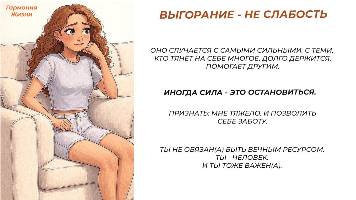 Эмоциональное выгорание или просто усталость? Автор: Виктория Денисова, психолог В моей практике люди часто приходят с жалобой: «Я устал, ничего не хочется, нет сил». Но когда начинаем разбираться глубже, оказывается — это не просто усталость, а эмоциональное выгорание. Как отличить одно от другого? 💤 Обычная усталость — появляется после нагрузки (рабочего дня, насыщенной недели); — проходит после отдыха, сна, смены обстановки; — силы постепенно восстанавливаются. 🔥 Эмоциональное выгорание — усталость становится хронической, не уходит даже после сна или отпуска; — появляется апатия: «Ничего не радует»; — раздражительность и ощущение, что всё «бессмысленно»; — тело реагирует: частые простуды, головные боли, бессонница. ✨ Главное отличие: усталость уходит после отдыха, а выгорание остаётся и нарастает. Что делать, если вы узнали себя? 1. Перестаньте требовать от себя продуктивности 24/7. 2. Найдите источник поддержки — разговор с близким, хобби, тёплое пространство, где можно бы