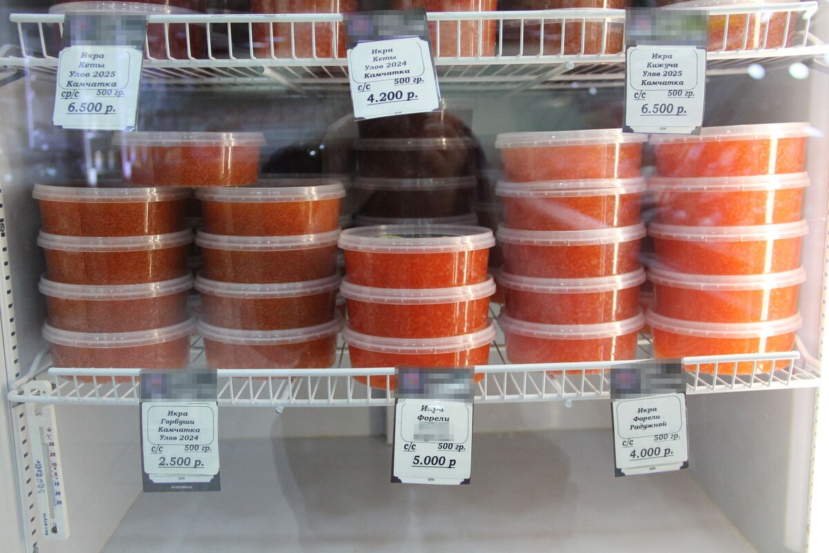 Еще в одном магазине на улице Ленина, специализирующемся в основном на морепродуктах, цены на икру разных рыб оказались выше предыдущих. Так, например, икра чавычи улова 2025 года стоит 12 000 и 14 000 рублей за килограмм, икра кеты и кижуча - 13 000, горбуши - 11 000. Вся продукция расфасована по полкило.