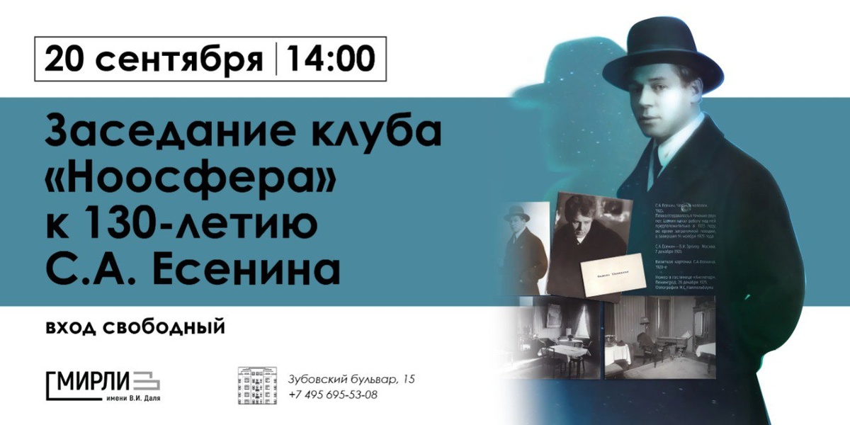 20 сентября состоится заседание клуба «Ноосфера», посвященное 130-летию со дня рождения С.А. Есенина. В программе заседания доклады: - Коллекция С.А. Есенина в ГМИРЛИ имени В.И. Даля Лариса Константиновна Алексеева, зав. отделом «Музей истории литературы ХХ века» ГМИРЛИ имени В.И. Даля - Сергей Есенин в Хамовниках: семейные и дружеские связи поэта Юлия Сергеевна Бурцева, специалист по творчеству С.А. Есенина - Георгий Якубовский и Сергей Есенин. По материалам семейного архива Г.В. Якубовского Вера Марковна Якубовская, филолог Начало в 14:00 Вход свободный