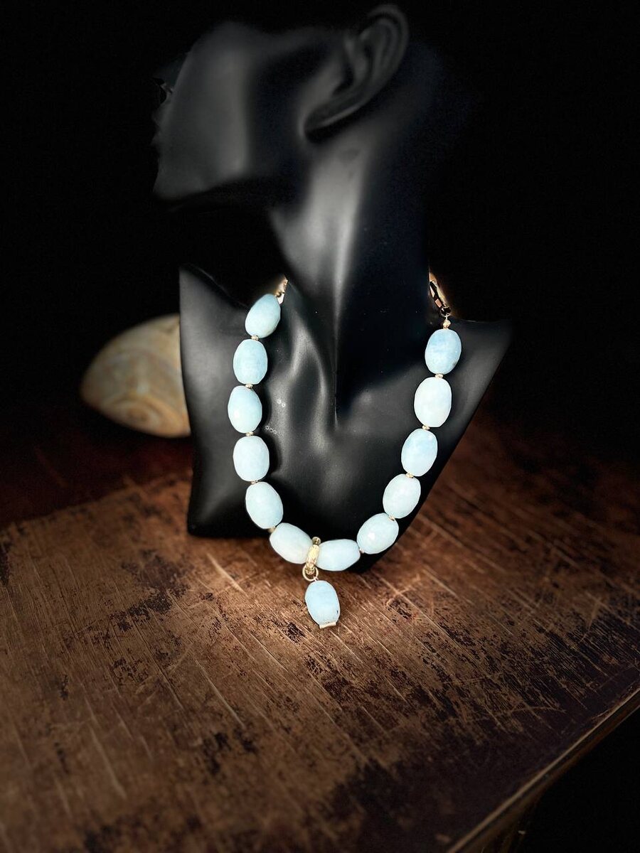 ... Когда вода всемирного потопа Вернулась вновь в границы берегов, Из пены уходящего потока На берег тихо выбралась любовь И растворилась в воздухе до срока, А срока было сорок сороков. И чудаки — еще такие есть — Вдыхают полной грудью эту смесь. И ни наград не ждут, ни наказанья, И, думая, что дышат просто так, Они внезапно попадают в такт Такого же неровного дыханья… (с) Баллада о любви, Высоцкий. Природный аквамарин: чокер и кулон-трансформер, его можно надевать отдельной подвеской и носить без чокера, или носить серьгой. Бусины аквамарина с геометричными мини-гранями, похожими на соты, поэтому бусины сияют даже в темноте, как будто весь свет вокруг с вами заодно. Бусины из рубрики "редкие находки" — повторов и похожих вам вряд ли получится найти) Аквамарин — всегда про любовь. И он практически вечный — эти бусины можно будет со временем пересочинить в другое украшение, а он всё будет, как новый. Такие аквамарины со временем становятся только более ценными (как и любовь, котора