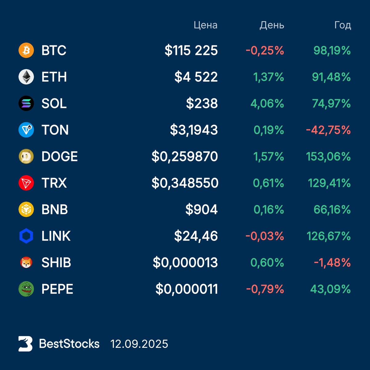 Курсы основных криптовалют: Bitcoin, Etherium, Solana, Toncoin, Dogecoin, TRON, BNB, Chainlink, Pepe, Shiba Inu на текущий момент