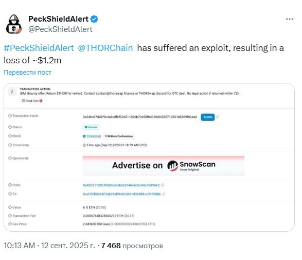 🏴☠️ Благодаря эксплойту хакеры похитили с THORChain ~$1.2 млн