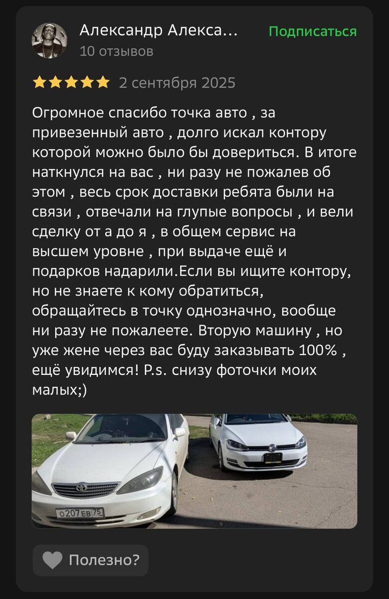 Ваши отзывы, лучшая мотивация для нас 🙌 Напоминаем, что мы работаем по всей России, не важно из какого Вы города! Доставим авто в любую точку нашей страны🇷🇺 ✅ Отзывы в 2ГИС: https://2gis.ru/irkutsk/geo/70000001079267695 ✅ Отзывы в Яндекс картах: https://yandex.ru/maps/org/tochka_avto/64756966508/ Благодарим за доверие и выбор нашей компании🤝 #отзывы_точка_авто