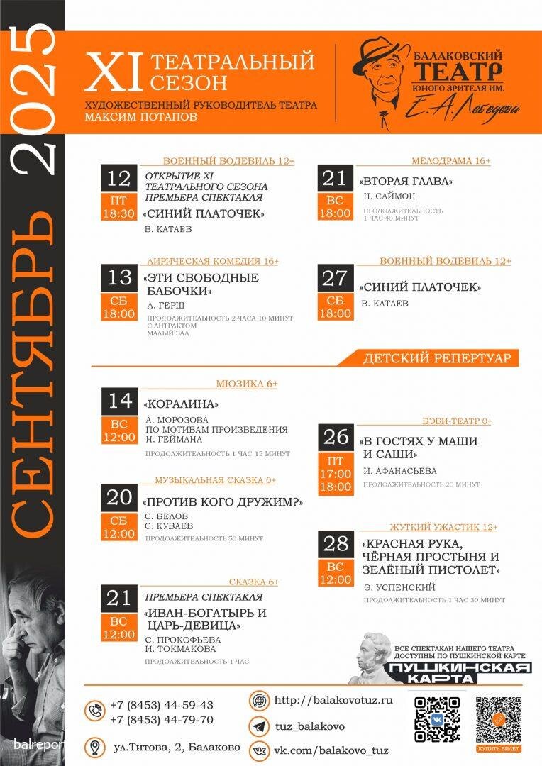 Сегодня, 12 сентября, Балаковский театр юного зрителя открывает 11-й театральный сезон премьерным спектаклем. Зрителям представят военный водевиль «Синий платочек» по произведению В.Катаева. Начало — в 18.30. -Это невероятно трогательная и добрая история, которую создала путаница в посылках и письмах, отправленных на фронт простыми жителями приволжского села. А вышитый мальчиком синий платочек, стал главным героем комедии и до самого конца сохранял интригу. Любимые песни, которые прозвучат в спектакле, не оставят равнодушным ни одного зрителя и позволят окунуться в далёкое прошлое, — рассказывают в театре. Следующий показ этого спектакля состоится 27 сентября.