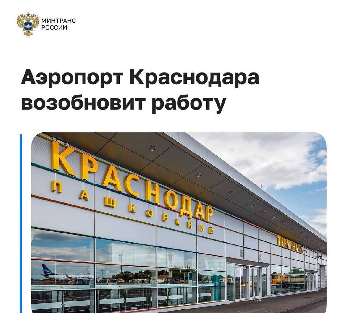 Аэропорт Краснодара открывают. Первый рейс из Москвы будет 17 сентября. На первом этапе возобновления полетов график будет ограничен с 9 до 19 часов.
