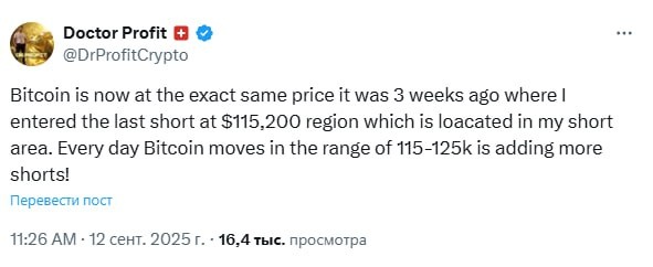 Биткоин сейчас находится на точно такой же цене, как и три недели назад, когда я открыл последний шорт в районе 115 200$, что находится в