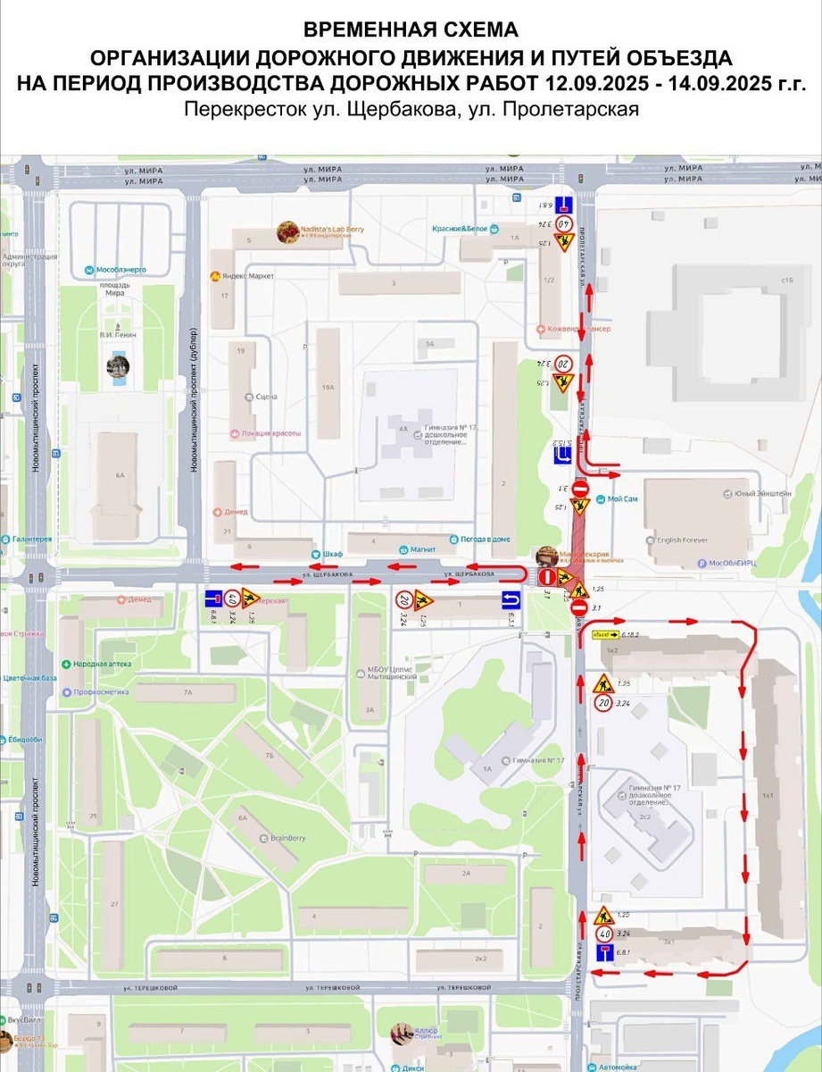 ⛔️ ПЕРЕКРЫТИЕ ДОРОЖНОГО ДВИЖЕНИЯ НА УЛИЦЕ ПРОЛЕТАРСКОЙ ⭕️ С 00:00 12 сентября до 00:00 14 сентября в Мытищах будет перекрыто движение на участке ул. Пролетарской — от ул. Терешковой до ул. Щербакова. ❗️На это время для транспорта будет организован объезд по временной схеме. ❤️ @mytischi_live | прислать новость