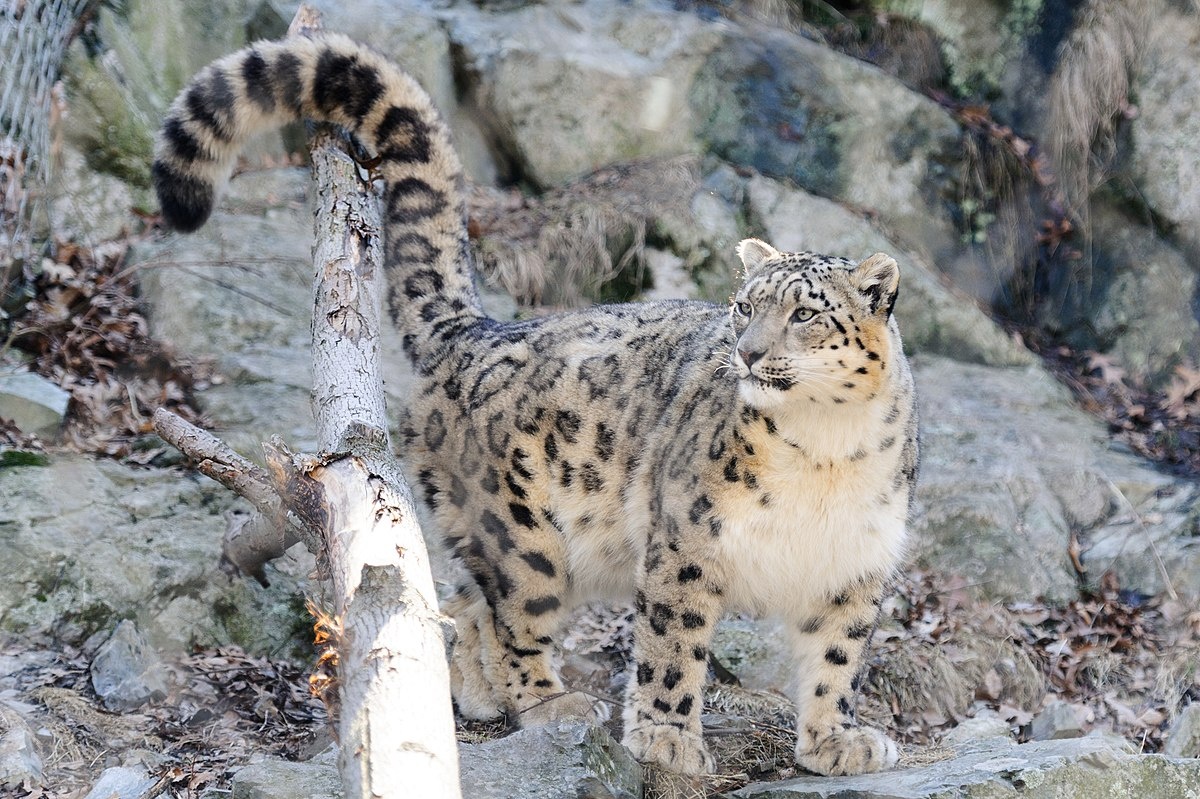 Во-вторых, хвост служит балансиром при движении по скользким склонам и прыжках с камня на камень. Он длинный, пушистый и относительно тяжёлый — иногда носить его утомительно. Поэтому на ровной местности ирбис зажимает хвост в зубах, снижая нагрузку на хвостовые мышцы и позволяя свободно двигаться.