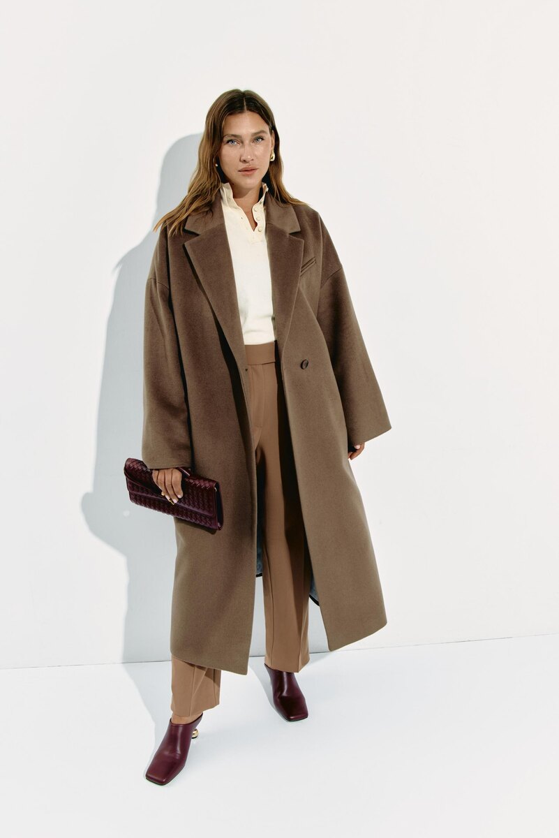 Этой осенью пальто зазвучало по‑новому: капучино из шерсти с вискозой, винный из 100% шерсти и глубокий графит с добавлением шелка