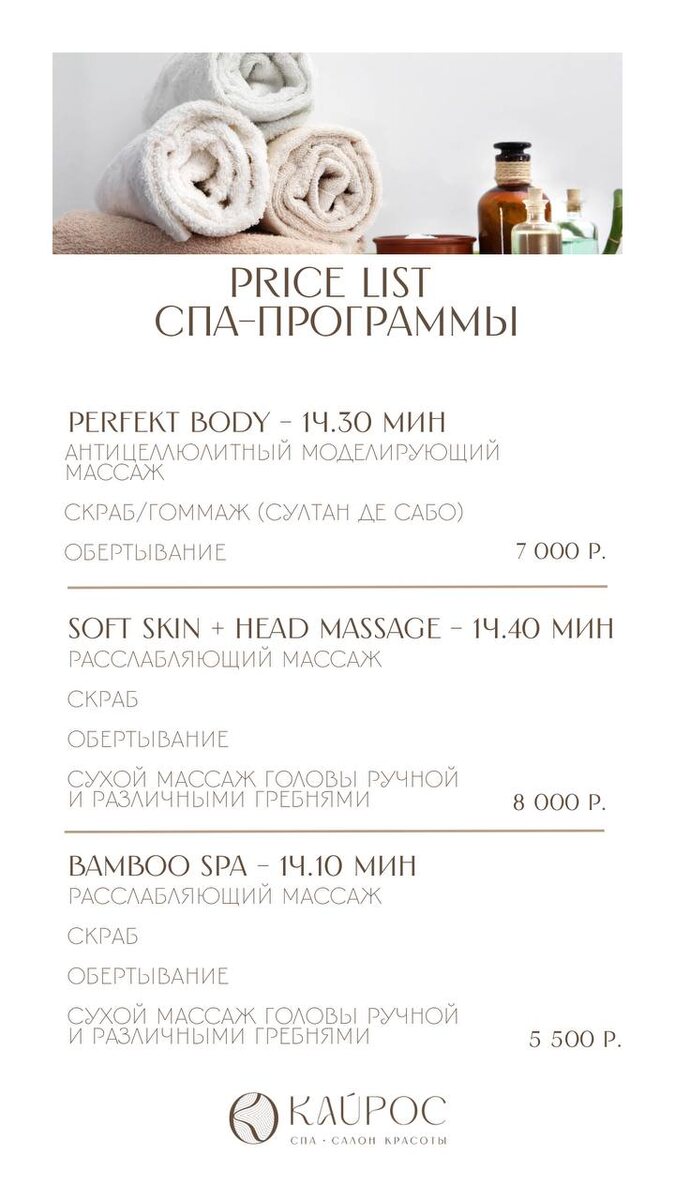 Прайс на СПА программы ✨ Хочешь на мгновение выйти из времени и подарить телу и душе истинный покой? Добро пожаловать в спа-пространство салона «Кайрос» — где каждый ритуал создан, чтобы вы погрузились в глубокий релакс, отключились от суеты и вернули себе гармонию. Здесь время замедляется. Ароматы, приглушённый свет, нежные прикосновения мастеров — всё работает на ваше состояние. Наши спа-программы — это не просто уход, это медитация через ощущения. Запись доступна по ссылке👇 https://dikidi.ru/kairosparnas