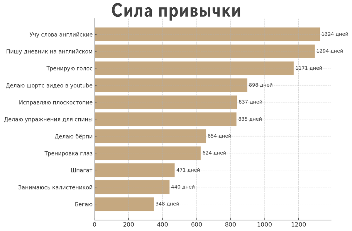 Теперь, когда люди спрашивают меня: “Как ты делаешь Х в течение 2-х лет, даже не видя результата” - за счёт привычек отвечаю я. А ещё через месяц привычка выстреливает и даёт накопленный результат за эти 2 года и 1 месяц.