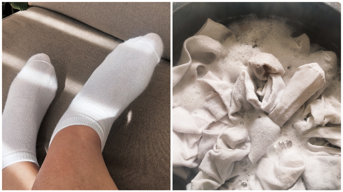 Попался ролик. Мужчина усердно и так уверенно показывал, как отбелить белые носки. В тазик кинул носки, к ним соду, потом моющее средство и к ним налил уксус. После всех ингредиентов залил все кипятком. И через какое-то время достал из тазика “блестяще” белые носки.