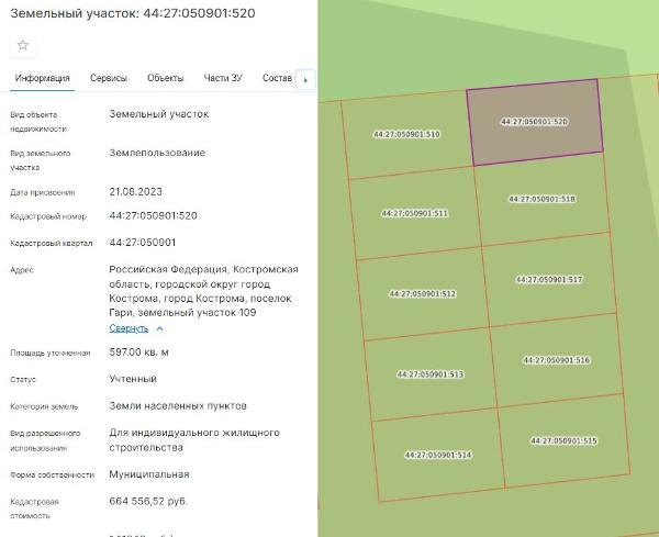 Название: Продажа земельного участка с кадастровым номером 44:27:050901:520, расположенного по адресу: город Кострома, поселок Гари