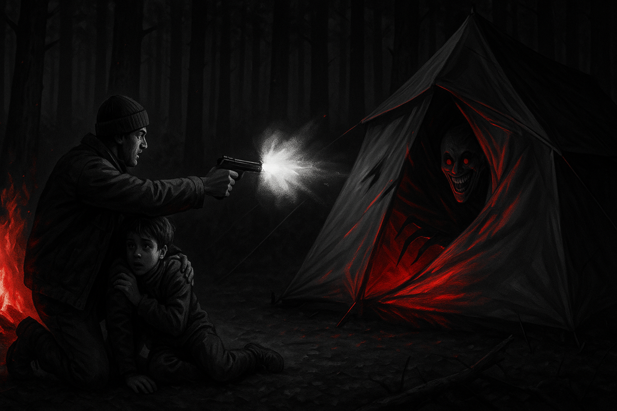 Секунды тянулись, и я слышал только звон в ушах и треск догорающего костра. Папа стоял надо мной, тяжело дыша, держа пистолет, направленный на разодранный вход.