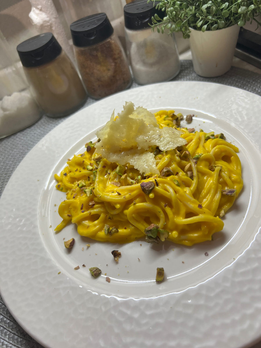 Ингредиенты: • Тыква — 1/2 среднего размера • Чеснок — 2-3 зубчика • Розмарин — по вкусу • Соль, перец — по вкусу • Творожный сыр — 120 г • Вода из-под спагетти — около 200 мл (100 мл + 100 мл) • Спагетти — по желанию (количество на порцию) • Сыр моцарелла (или другой) — 50 г • Фисташки и сырные чипсы — для подачи (по желанию) --- Приготовление: 1. Подготовка тыквы: Очистите тыкву от семечек и нарежьте её дольками. Выложите на противень, застеленный пергаментом. Добавьте чеснок, розмарин, посолите и поперчите по вкусу. 2. Запекание: Разогрейте духовку до 200°С и запекайте тыкву с чесноком и розмарином около 30 минут, пока она не станет мягкой и ароматной. 3. Приготовление соуса: Переложите запечённую тыкву вместе с чесноком в блендер. Добавьте творожный сыр и 100 мл воды из-под спагетти. Взбейте до однородной кремовой массы. 4. Завершение соуса: Перелейте соус в сковороду или сотейник, добавьте ещё 100 мл воды из-под спагетти и 50 г тёртого сыра (у меня — моцарелла). Под