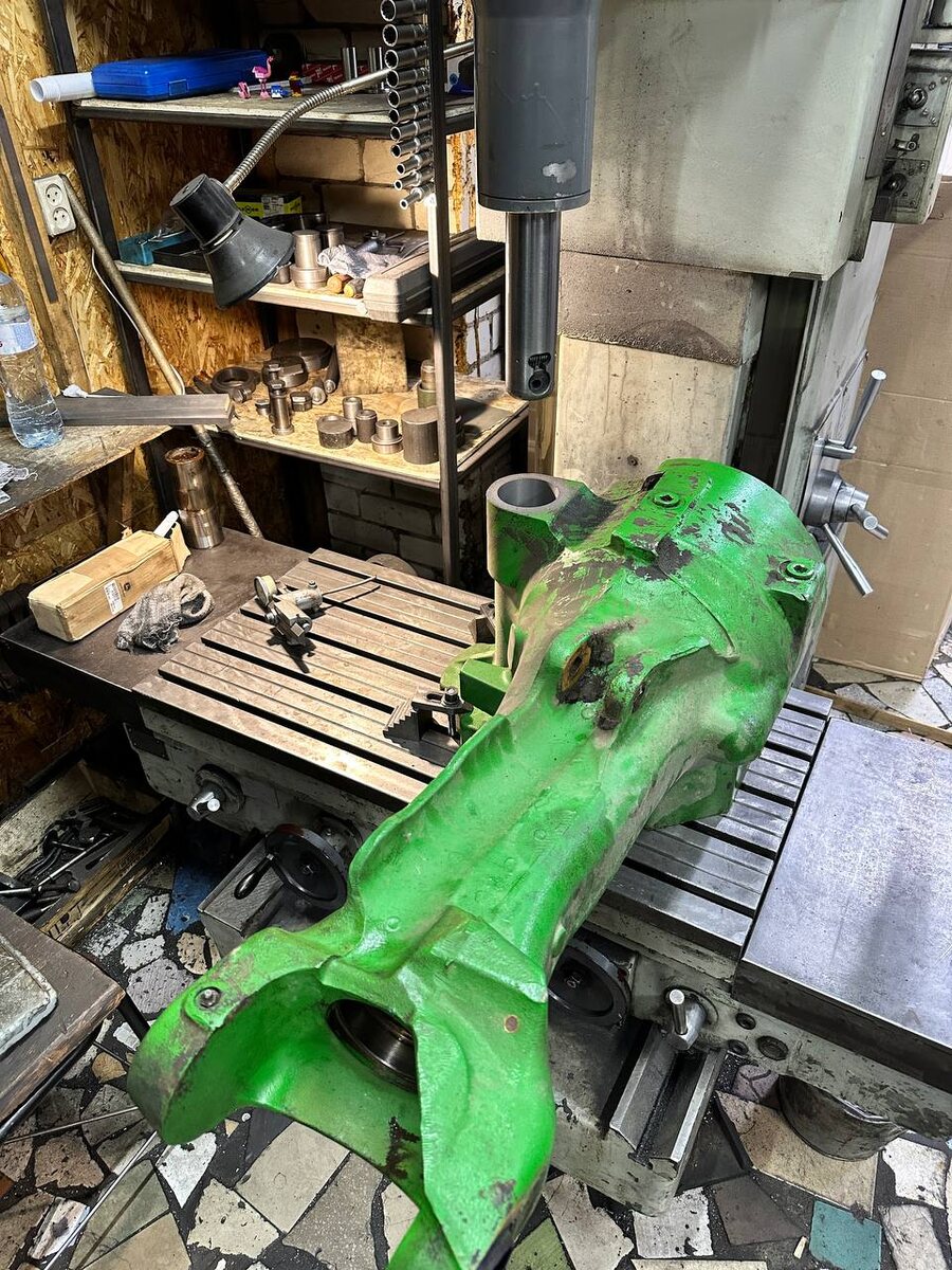 Восстановление посадки John Deere. Привезли опять на ремонт часть моста с машины John Deere. Нужно восстановить посадку под шкворень, так как ее разбило и он там болтается, хотя должен сидеть на натяге. Сам шкворень - ф76,18. Втулка - ф89,00. Посадка под втулку - ф88,87. Натяг получается на втулку - 0,13. Натяг на шкворень сделаю - 0,08. Во втулке оставляю припуск для расточки и припуск по высоте втулки. После сажаю втулку в посадку на горячую. Все видно на фотках. Далее растачиваю под шкворень. Обнижаю втулку, планирую плоскость. Сверлю отверстие под штифт и сажаю сам шкворень, тоже на горячую. Но это выложу в следующем посте. #johndeere #мост #ремонт